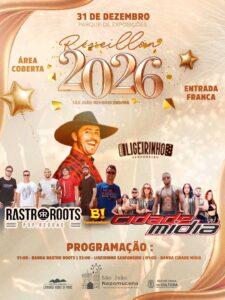 12/10/2025A Prefeitura de São João Nepomuceno através da Secretaria Municipal de Cultura, Turismo e Patrimônio Histórico divulga a programação do Revéillon 2026, no Parque de Exposições, com shows musicais e DJ’s, na noite do dia 31 de dezembro, com entrada franca.