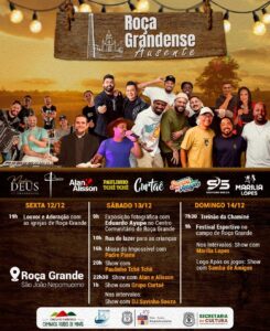 12/11/2025Entre os dias 12 a 14 de dezembro de 2025, o distrito de Roça Grande, em São João Nepomuceno receberá o evento “Roça-grandense Ausente”, numa realização da Secretaria Municipal de Cultura, Turismo e Patrimônio Histórico da Prefeitura em parceria com a Comissão de Desenvolvimento de Roça Grande (CODERG) e apoio do Circuito Turístico Caminhos Verdes de Minas.