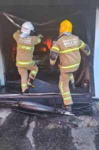 De imediato, foi realizada entrada forçada pela garagem, com o objetivo de promover a ventilação do ambiente. Em seguida, procedeu-se ao combate ao incêndio, atingindo tanto o veículo quanto os demais utensílios e materiais existentes no local.