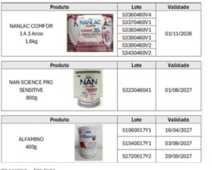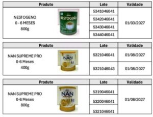 A Agência Nacional de Vigilância Sanitária (Anvisa) proibiu a comercialização, a distribuição e o uso de alguns lotes de fórmulas infantis das marcas Nestogeno, Nan Supreme Pro, Nanlac Supreme Pro, Nanlac Comfor, Nan Sensitive e Alfamino, fabricadas pela Nestlé Brasil. A decisão consta da Resolução nº 32/2026, publicada nesta quarta-feira (7), e tem caráter preventivo.