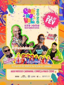A Secretaria Municipal de Cultura, Turismo e Patrimônio Histórico da Prefeitura de São João Nepomuceno divulga a programação gratuita do Pré-carnaval 2026, a ser realizado nos dias 6 e 7 de fevereiro, na Praça da Estação, no centro da cidade, com shows musicais, dj’s, eleição do Rei Momo e a Rainha do carnaval e o bloco do Malvadão, com desfile pelas ruas.