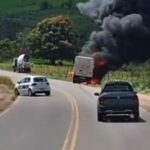 Caminhão carregado com frango congelado pega fogo e é saqueado em Leopoldina