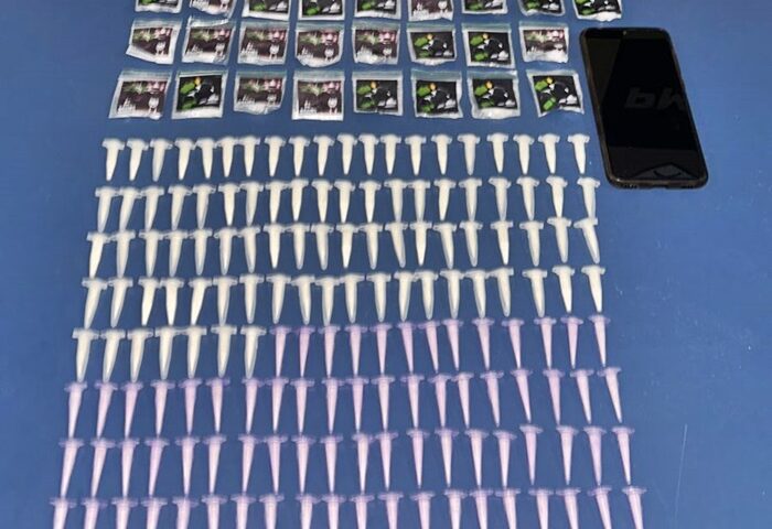 Durante a verificação do material, foram apreendidos 196 pinos de cocaína, 25 papelotes da mesma substância e um aparelho celular. Diante dos fatos, o autor recebeu voz de prisão em flagrante pelo crime de tráfico de drogas.