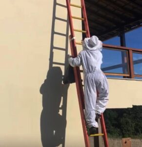 Em casos como esse aqui no município, o mais indicado é buscar orientação junto a Defesa Civil ou Secretaria de Meio Ambiente, onde possuímos parcerias com apicultores especializados, que realizam a retirada de colmeias de forma adequada, sem causar dano ao meio ambiente.