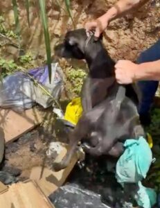 A PM foi acionada por um vereador, após denúncias de que um homem estaria sacrificando um animal a pauladas. Ao chegar no local, a equipe encontrou o cão escondido dentro de sacos de lixo, coberto por papelões e entulhos, agonizando, mas ainda com vida.