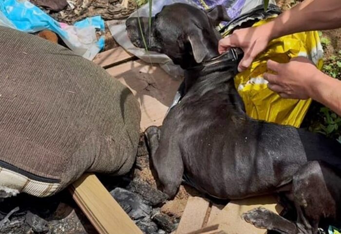 A PM foi acionada por um vereador, após denúncias de que um homem estaria sacrificando um animal a pauladas. Ao chegar no local, a equipe encontrou o cão escondido dentro de sacos de lixo, coberto por papelões e entulhos, agonizando, mas ainda com vida.