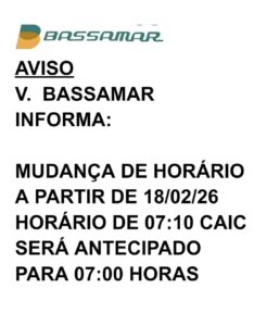 A Viação Bassamar também informa mudança de horário a partir do dia 18/2/2026 para horário CAIC, das 7h10, antecipado para às 7h.