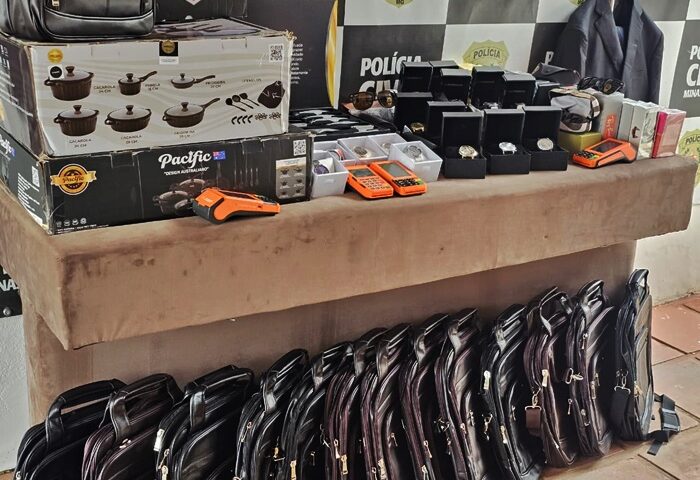 Entre os produtos apreendidos estão ternos, vestuário, óculos, perfumes, malas, mochilas, panelas e faqueiros de marcas renomadas, comercializados de forma enganosa.