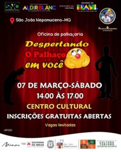 Através da Política Nacional Aldir Blanc (PNAB) e parceria com a Secretaria Municipal de Cultura, Turismo e Patrimônio Histórico da Prefeitura de São João Nepomuceno, o Centro Cultural “Gabriel Procópio Loures” receberá oficina e espetáculo de palhaçaria, nos dias 7 e 8 de março, com o premiado ator e diretor juiz-forano, Valdir Alves.
