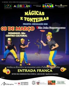 No dia 8 de março (domingo), às 16h, a apresentação do espetáculo “Mágicas e Tonteiras” – Projeto Circulação 2026, com o carismático Palhaço e mágico Rosquinha (interpretado por Valdir Alves). A entrada é franca e a retirada dos ingressos é pelo Sympla (CLIQUE AQUI).