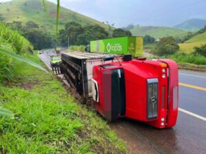 De acordo com as informações iniciais, o veículo tombou às margens da rodovia por motivos ainda desconhecidos. O motorista, de 39 anos que estava sozinho no caminhão, foi socorrido pela equipe da concessionária EcoVias RioMinas com ferimentos leves e encaminhado ao Hospital São Paulo de Muriaé.
