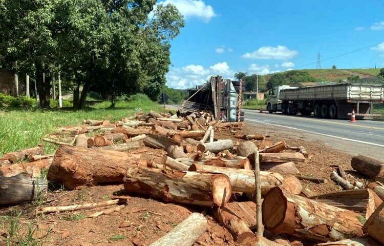 Caminhão carregado com madeira tomba na BR-116 em Muriaé