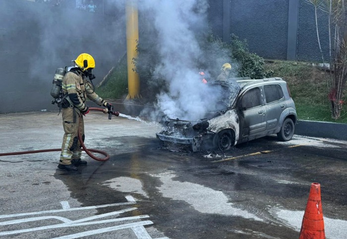 Bombeiros combatem incêndio de automóvel em estacionamento de supermercado em JF