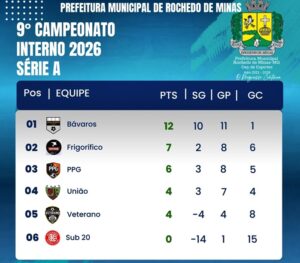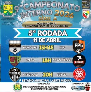 A 5ª rodada do Campeonato Municipal de Rochedo de Minas promete ser eletrizante e definirá os quatro semifinalistas neste sábado 11 de abril no Estádio Laerte Medina de Mendonça. A equipe do Bávaros está classificada com 100% de aproveitamento até aqui. O Sub-20 está eliminado.