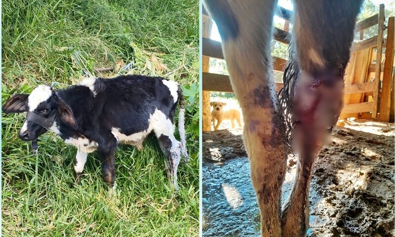 O bezerro foi encontrado com sangramento na pata traseira esquerda e precisou ser levado para atendimento veterinário.