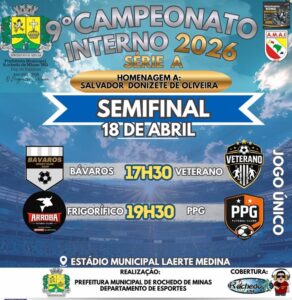04/17/2026Neste sábado 18 de abril, serão conhecidos os grandes finalistas do Campeonato Municipal de Futebol de Rochedo de Minas Séria A edição 2026.