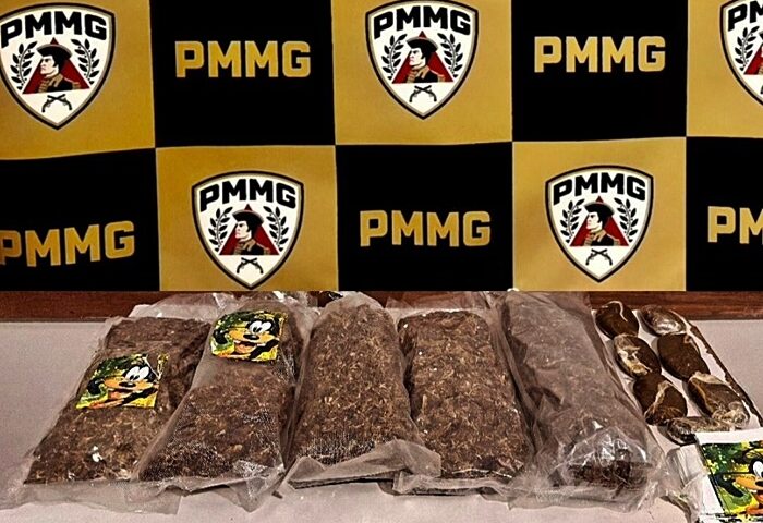 Após a abordagem foram localizadas em sua posse, no interior de sua mala, sete porções de haxixe, 05 pacotes grandes de maconha e adesivos para identificar as drogas.